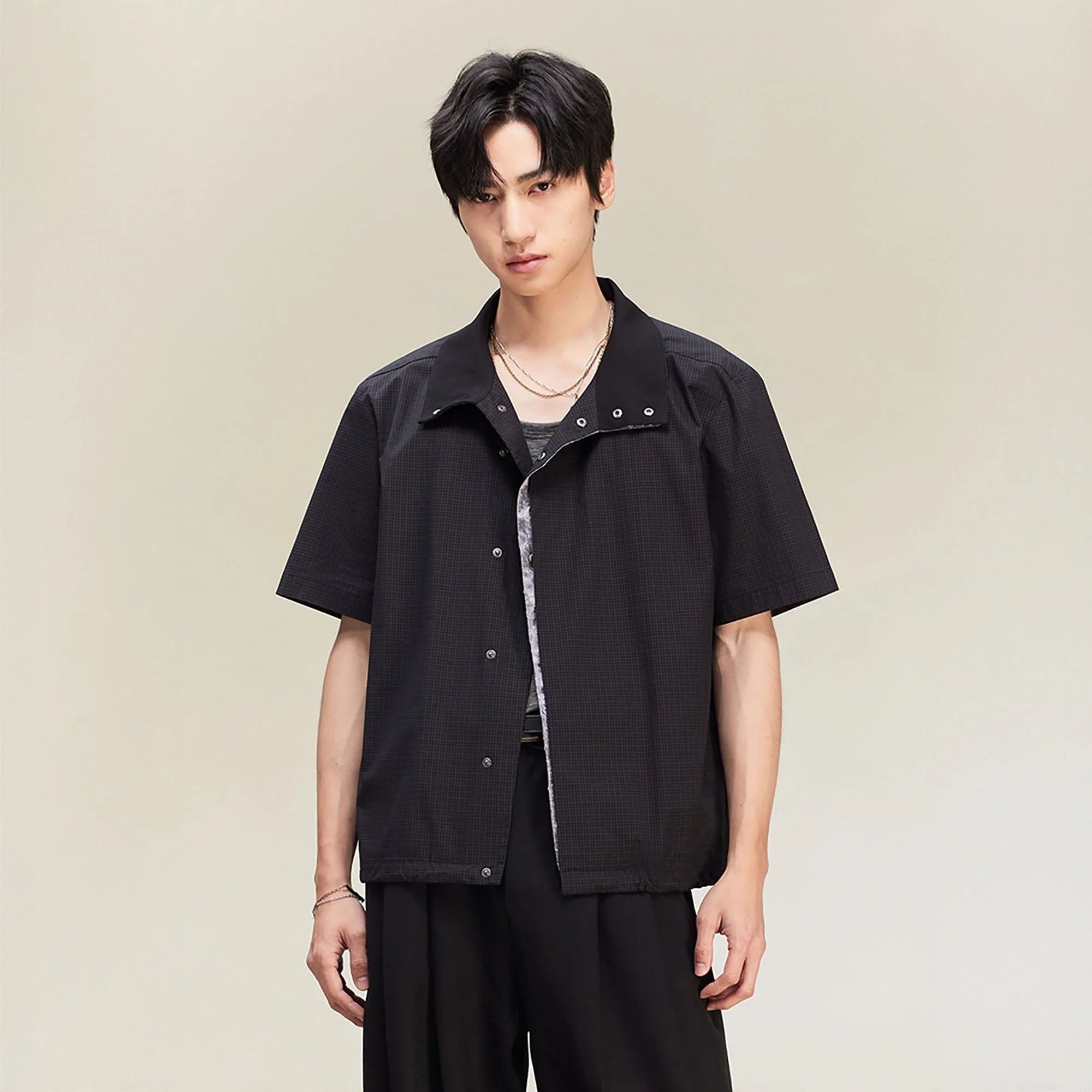 This short-sleeve shirt plays with tailored codes through a micro-check textile and an off-center snap placket that skews classic proportions. The collar is constructed in a contrast fabric, with metal snap detailing that allows it to stand or fold. The interior placket reveals a textured trim when worn open, lending a subtle twist to its clean geometry. Cut in a slightly oversized fit, the piece offers both structure and ease.